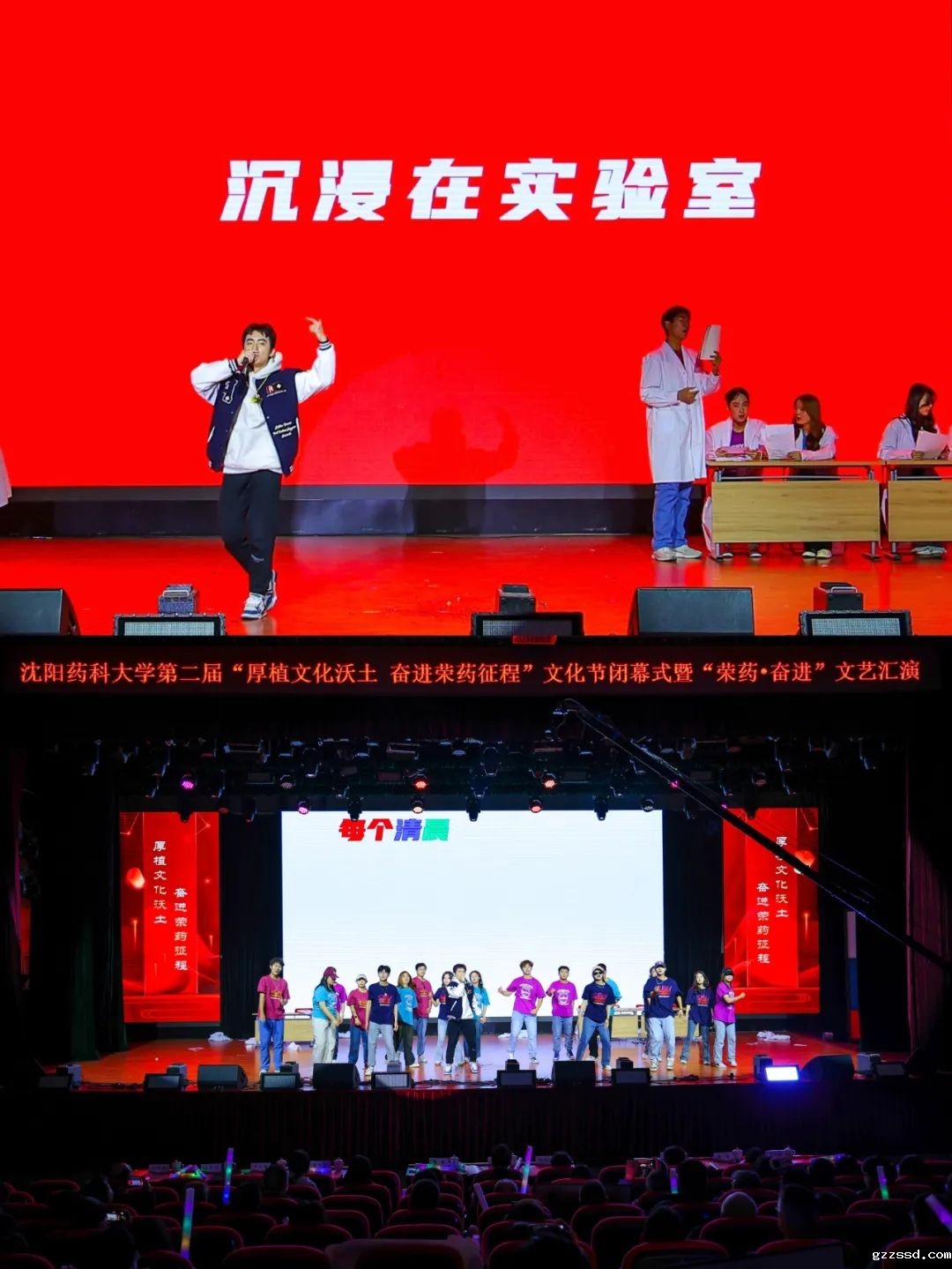 文化节闭幕式以“荣药·奋进”文艺汇演完美收官。文艺汇演以“药·初”“药·华”“药·济”三个篇章为核心,在气势恢宏的舞蹈《飞向春天》中开场,在校师生、校友、离退休教职工、第三方员工等近300名演职人员齐上阵,通过歌曲、舞蹈、啦啦操、朗诵、舞台剧、三句半等形式的演绎,展现了学校93年来坚守初心、坚定信心、守正创新、荣药奋进的发展历程,呈现了一场精彩纷呈、高潮迭起的文化盛宴。
