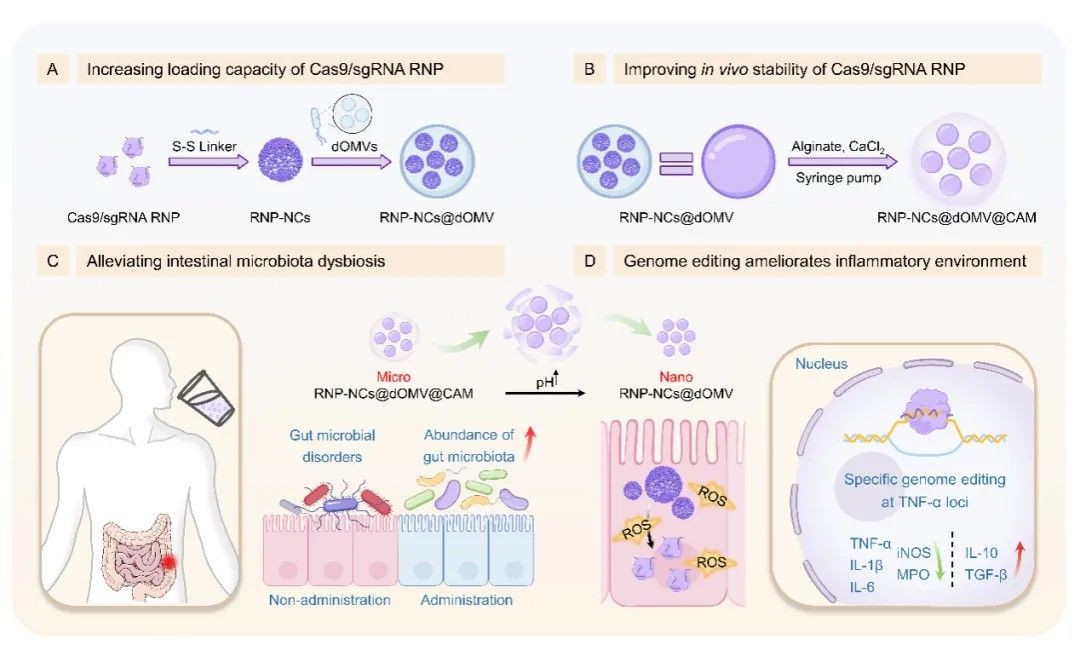该研究如同发现了一种能够精准定位并修复基因的“微型手术刀”。通过巧妙的纳米封装技术,他们将CRISPR-Cas9技术转化为一种口服系统,实现了精准的基因“修复”。这种口服微纳基因编辑系统,旨在通过靶向肠道中过量的TNF-α,实现对IBD的特异性基因治疗(图1)。该系统通过二硫键桥接Cas9/sgRNA核糖核蛋白(RNP),将其组装成纳米簇(NCs)。这些RNP-NCs随后被封装在源自大肠杆菌Nissle 1917的可靶向炎症细胞的去脂多糖外膜囊泡(dOMVs)中,进一步被一层钙藻酸盐微球(CAMs)所包裹。借助CAMs的保护作用,口服给药系统能够在进入胃部时抵抗胃酸降解,实现对肠道的高效靶向输送。随着pH值逐渐升高,微米级的CAMs溶胀破裂,释放出封装在dOMVs中的纳米级RNP-NCs到肠道中。这些RNP-NCs@dOMVs能够穿透粘膜屏障,靶向炎症性巨噬细胞,并在其中条件性激活Cas9/sgRNA RNPs,有效进行TNF-α基因的基因组编辑。这样的口服微纳基因编辑系统为IBD的治疗提供了一个充满希望的转化平台。