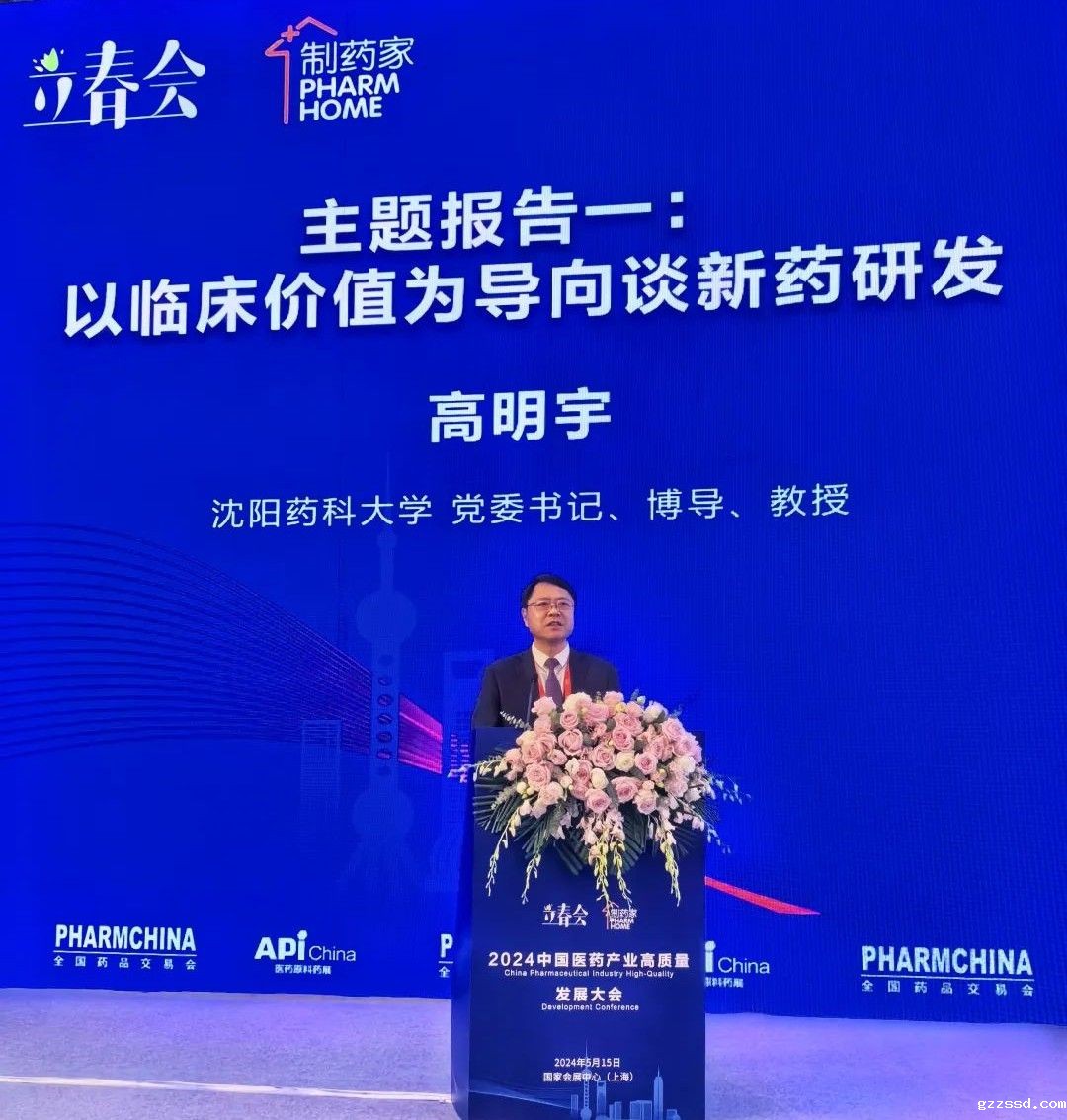 会上,高明宇作了题为《以临床价值为导向谈新药研发》的大会主题报告。他着眼健康中国战略需求、医药行业创新发展和临床用药现实需要,深刻阐述了以临床价值为导向新药研发的提出背景;聚焦学术理念、药监实践、国家法规、全面实施四个层面,细致梳理了我国以临床价值为导向新药研发的发展脉络;结合学校自主研发的重磅新药品种典型案例,详细介绍了学校坚持临床价值导向的新药研发实践;展望医药产业未来创新发展需求,深入剖析了以临床价值为导向的新药研发趋势。他指出,坚持以临床价值为导向,面向未被满足的临床需求进行多元化新药研发,是生物医药产业克服同质化研发问题、实现医药创新从量变到质变的必然要求。他表示,学校自成立以来,始终面向国家重大需求和人民生命健康,坚持以患者为中心、以临床价值为导向,推动新药研发与临床需要相适应。革命战争时期,学校投身战备药研发,解救无数将士于病痛;改革开放以来,结合临床用药需求,围绕恶性肿瘤、神经退行性疾病、糖尿病、肺结核等重大疾病开展创新品种研发,创造了国内生物医药研发领域多个“第一”,获得新药证书137个、临床批件117件。他认为,未来新药研发要明确为患者提供更优治疗选择的最高目标,将临床价值导向贯穿新药研发各个环节,借助药物研发新技术新手段,瞄准新靶点、新机制、新结构,引导产业提升源头创新能力、加速创新药产能出清,推动多领域协同融汇、多学科交叉融合,促进现代医药创新发展。
