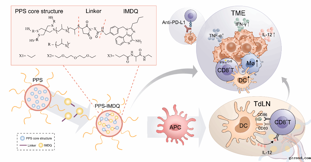 检查点抑制剂疗法并未使所有患者受益,佐剂在增强免疫反应以实现有效的癌症免疫治疗方面发挥着关键作用。然而,它们的全身毒性和次优的激活动力学构成了重大挑战。因此,该研究开发了一种通过聚丙烯硫化物纳米颗粒(PPS NPs)递送TLR7/8激动剂以增强抗肿瘤免疫的策略,旨在通过调节树突状细胞(DCs)的激活动力学改善治疗效果并减少系统毒性。课题组设计了三种不同的连接子(烷基、三乙二醇、二肽)用于将TLR7/8激动剂共价连接至PPS NPs,并发现烷基连接子纳米颗粒具有最佳性能。它能够选择性延长DCs的激活时间,减少其他免疫细胞(如巨噬细胞)的过度激活,从而避免免疫相关毒性。在小鼠EG.7-OVA肿瘤模型中,烷基-TLR7/8激动剂显著延缓肿瘤生长,并显著延长了生存期,同时诱导肿瘤微环境中的抗原特异性CD8+ T细胞浸润和活化。此外,毒性评估表明,与自由TLR7/8激动剂相比,PPS-TLR7/8激动剂具有更高的最大耐受剂量和更宽的治疗窗口,且未引发明显的肝肾毒性。机制研究显示,烷基纳米颗粒通过缓慢释放TLR7/8激动剂,持续刺激DCs分泌IL-12,优化了肿瘤微环境并增强了免疫抑制的缓解效果。相比之下,巨噬细胞因吞噬体酸化更强、酶活性更高,导致对TLR7/8激动剂的响应较弱。这种纳米平台通过降低免疫相关毒性和增强抗肿瘤免疫反应,为个性化癌症免疫疗法提供了新的可能性。未来研究将进一步验证其在晚期肿瘤模型中的潜力,并探索在其他免疫调节剂(如STING激动剂)中的应用。